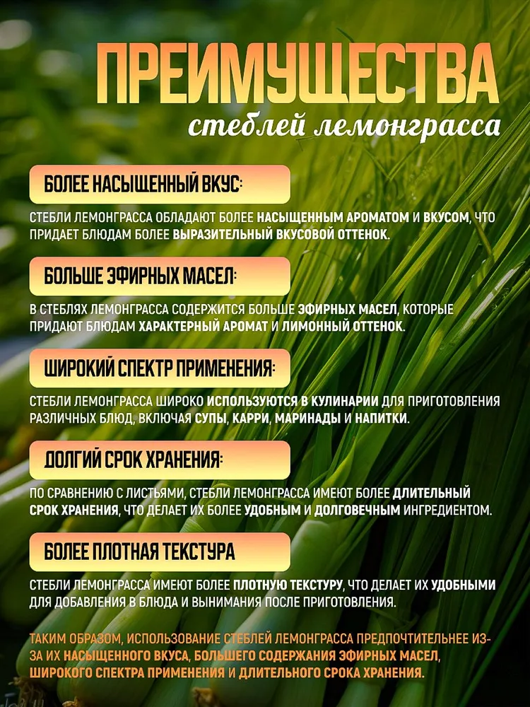 В Екатеринбурге купить лемонграсс можно в сушеном и измельченном виде. Это неотъемлемая часть многих кухонь мира. Однако использовать растение можно и свежим, добавляя во время приготовления блюд для придания неповторимого вкуса. Растение обладает уникальным химическим составом, что обеспечивает широкий спектр его благоприятного воздействия на организм человека. Многие любят, потому что знают — это отличный антидепрессант!