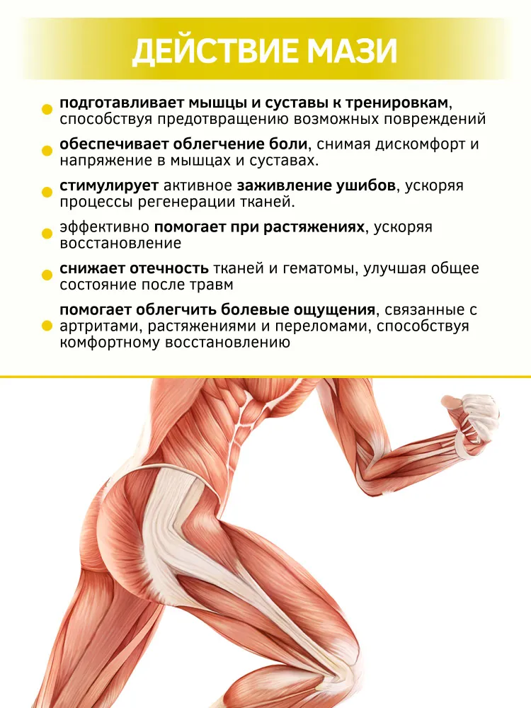 Способ применения: крем необходимо наносить 2-3 раза в день на проблемные места, ушибы, синяки мягкими массажными движениями. Крем можно использовать до тренировки для натирания мышц и суставов, действует как разогревающее и обезболивающее средство для интенсивной тренировки.